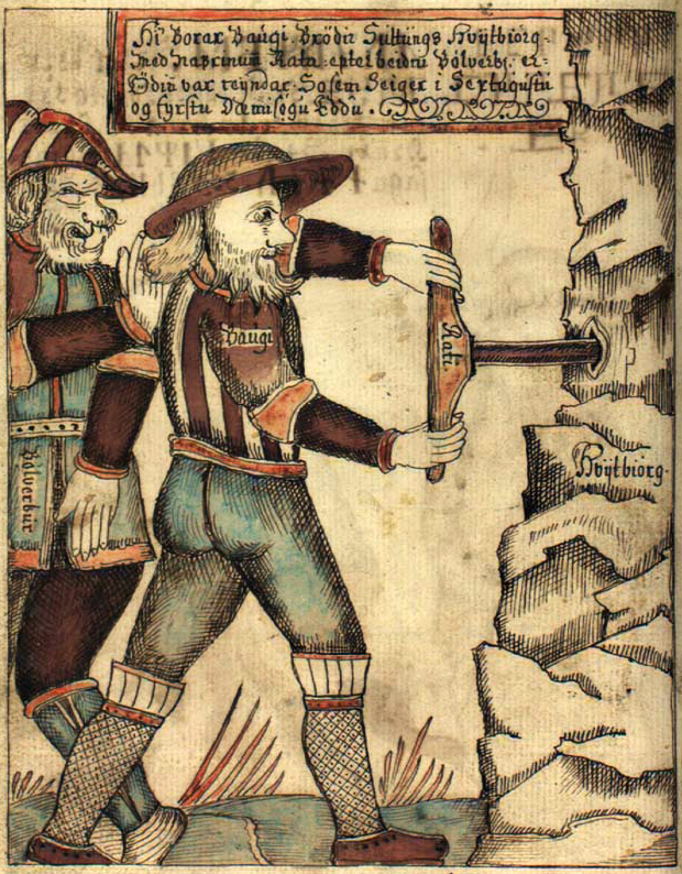 A slightly different account of this incident from the Skáldskaparmál is depicted in the image below, where Suttung’s brother, Baugi, has been co-opted by Odin, now disguised in the form of Bölverk, to do the drilling.